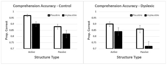 In terms of comprehension, we found a pattern of results that was consistent with both noun-verb-noun and semantic plausibility heuristics impacting comprehension. For controls, our results were largely consistent with the predicted pattern shown in the lower-left panel of Figure 1. For dyslexics, we found an interaction, which is consistent with the pattern shown in the lower-right panel of Figure 1. These results show similarities with Wiseheart et al.’s study [27], as they also found the same difference in comprehension between the two groups, with dyslexics showing poorer comprehension than non-dyslexics, especially with passive sentences. It is important to note that Wiseheart et al.’s [27] study did not manipulate plausibility, so this is not a direct comparison between the two experiments.