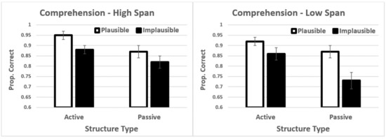 When working memory was included in the model, there was a significant main effect of sentence structure t = −2.37, p = 0.018, and a significant interaction between sentence structure and plausibility t = 2.75, p = 0.006. There was also a marginal three-way interaction between sentence structure, plausibility, and working memory t = −1.88, p = 0.06. The three-way interaction with group was not significant in this analysis (i.e., when working memory was in the model). The correlations in Table 3 show that working memory correlations with accuracy were positive. In order to conceptualise the marginal three-way interaction, we divided the sample into high-spans and low-spans. The means for each group are presented in Figure 3. As can be seen in Figure 3, the difference between high- and low-spans is quite striking. Results for the high-spans showed a double main effect: structure type and plausibility. In contrast, for low-spans, there was an interaction (compare to Figure 1). What these results showed is that participants with lower working memory showed particular difficulties with the passive-implausible sentences, similar to dyslexics in the prior analysis. However, dyslexia was not significant in this analysis. This demonstrated that there is related and overlapping variance between dyslexia status (group) and working memory, despite non-significant differences at the group level. We take this issue up in greater detail in the Discussion section.