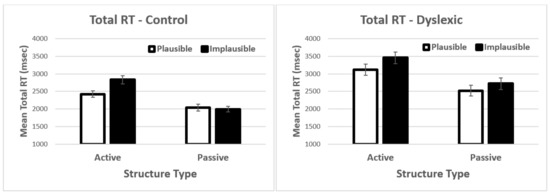 Results showed significant main effects of structure type t = −5.52, p < 0.001, plausibility t = −3.63, p < 0.001, and group t = −3.34, p = 0.001 (see Figure 4). Active sentences, implausible sentences, and dyslexic participants all showed longer total reading times (see Section E, Supplementary Materials). None of the interactions were significant. Recall that the reading times on the two additional words in the passives were removed from these analyses. This is the reason for the counter-intuitive result of actives having longer reading times than passives. The unadjusted reading times are presented in the Supplementary Materials. For both analyses, the results were similar (i.e., significant main effects and no interactions).
