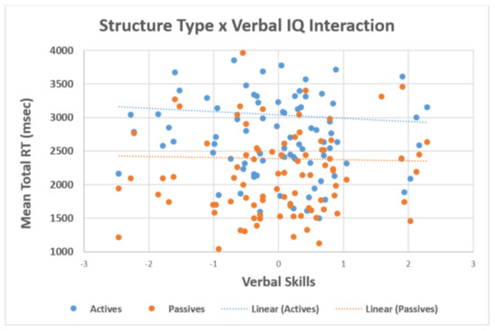 When verbal intelligence was included in the model, we observed significant main effects of structure t = −6.01, p < 0.001, plausibility t = −3.59, p < 0.001, and group t = −3.73, p < 0.001. In addition, there was also an interaction between structure type × verbal intelligence t = 2.36, p = 0.018, in which individuals with lower verbal intelligence had higher reading times and individuals with higher verbal intelligence had lower reading times. The effect was greater for the actives than the passives (see Figure 5). The correlations in Table 4 further highlight that the relationships were negative (i.e., individuals with higher working memory and higher verbal intelligence had lower reading times).