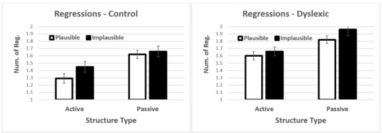 Results showed significant main effects structure type t = 4.64, p < 0.001 and group t = −2.23, p = 0.027 (see Figure 6). Passive sentences and dyslexic participants showed higher rates of regressions (see Section F, Supplementary Materials). None of the interactions were significant.