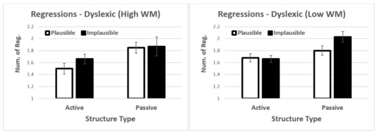 When working memory was included in the model, we observed a significant main effect of structure type t = 2.60, p = 0.009. In addition, there was also a significant four-way interaction t = −2.15, p = 0.032. Follow up three-way analyses showed no significant main effects or interactions in controls. For dyslexics, the three-way interaction was marginally significant t = 1.79, p = 0.075 (see Figure 7). The driving factor behind the marginal interaction was that low-span participants showed increased regressions in both the active-plausible condition and the passive-implausible conditions (i.e., the easiest and most difficult conditions). We did not explore this interaction further given that it was only marginally significant.