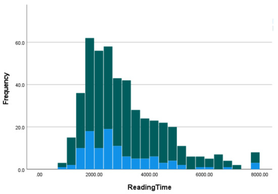 Stacked histogram showing reading times for correct trials (green) and incorrect trials (blue).