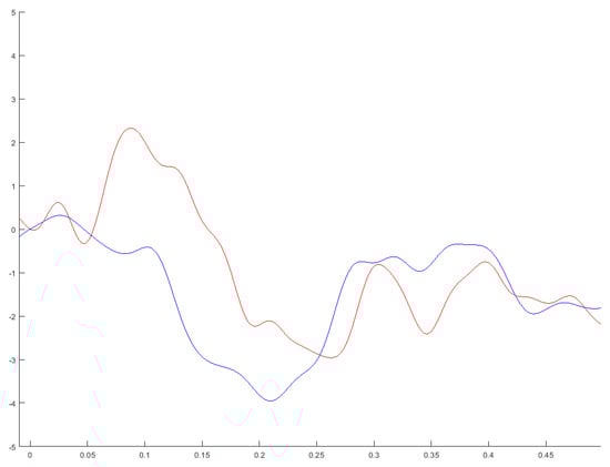 Grand averaged difference waveforms for changes in pitch under frontal Fz electrode in schizophrenia patients (red line) versus healthy controls (blue line). The X axis indicates a 0.5 s window post-stimulus with a 0.01 s pre-stimulus time window. Y axis represents the MMN amplitudes (5 to −5 µV). MMN difference waveforms were not statistically different.