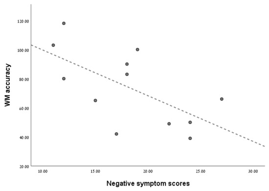 WM accuracy scores are related to negative symptom severity in the SZ group. The figure illustrates a significant relationship between WM accuracy and negative symptom severity in schizophrenia patients. The Y axis represents working memory (WM) accuracy; the maximum total accuracy score is 126 (number of hits). The X axis represents negative symptom severity scores ranging from a minimum score of 7 to a maximum score of 49.