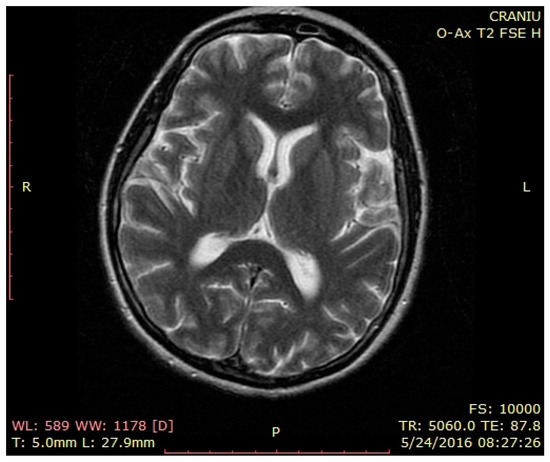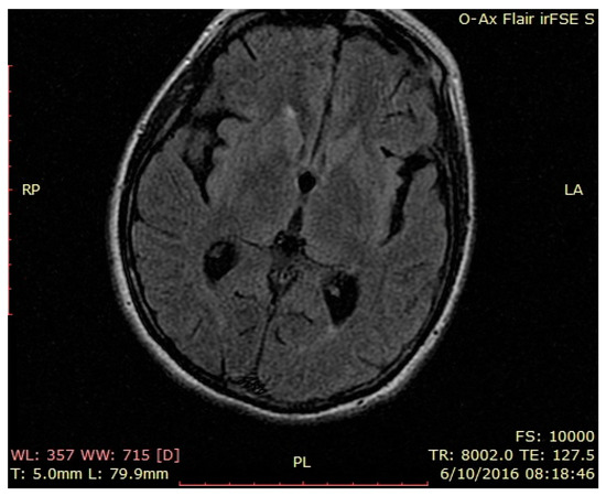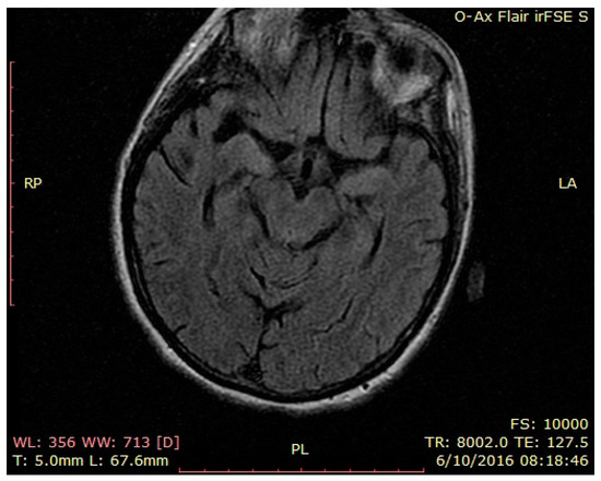 Lumbar puncture: cerebrospinal fluid had normal transparency, 5 leucocytes/mL, 15 erythrocytes/mL, 67 mg/mL glucose, 0.49 g/L proteins (normal findings). Laboratory workout was unremarkable: except hypokalemia: 2.3 mmol/L (normal range 3.5–5.1), hypoproteinemia: 5.5 g/dl (normal range 6.4–8.2 g/dl), hypocalcemia: 7.5 mg/dl (normal range 8.5–10.1 mg/dl), blood magnesium normal: 1.8 mg/dl (normal range 1.8–2.4 mg/dl), slight anemia erythrocytes: 3.61 × 10 6/m, thrombocytopenia: 107 × 10 3/m, normal leucocytes: 6.9 × 10 3/m, ESR: 23 mm/1H, CRP: 11.62 mg/L (normal range 0–3 mg/L), inflammatory workout normal, no infection was detected. At the time, we were inclined to consider the entire clinical picture as a catatonic state in a psychotic patient. One of the strong arguments for that idea was the unreactive behavior without physical evidence for neurologic involvement and resistance to eye opening. The clinical picture was completed in the next days with slight myoclonic movements, then an epileptic seizure, followed by coreo-atetotic movements. The patient had periods of opened eyes, spontaneous pursuit gaze, and sporadic pronunciations of the name of her preferred singer. A second brain scan was performed with normal results (Figure 4, Figure 5 and Figure 6—second brain MRI, FLAIR images). Pelvic MRI was normal (Figure S1).
