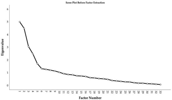 An exploratory factor analysis extracting factors with principal axis factoring, using an oblique rotation, was applied to assess the underlying structure of the latent variables explaining the covariance amongst the responses to our questionnaire from the 115 included participants with s-DP. The data demonstrated good factorability: The Kaiser–Mayer–Olkin measure of sampling adequacy was 0.696 and above the accepted value of 0.6 [94] (p. 668). Additionally, all items except for four (0.457–0.476) met the cutoff of above 0.50 for individual measures of sampling adequacy when inspecting the diagonal element of the anti-image correlation matrix in the preliminary analysis of the data’s fit for exploratory factor analysis [97]. As it was close to the cutoff, the items were retained. Bartlett’s test of sphericity was significant At first, solutions with up to 10 factors emerged with initial eigenvalues >1, together explaining 55.9% of the extracted variance. Investigating the scree plot (Figure 1) suggested retaining five factors due to the elbow on the curve [93,98].
