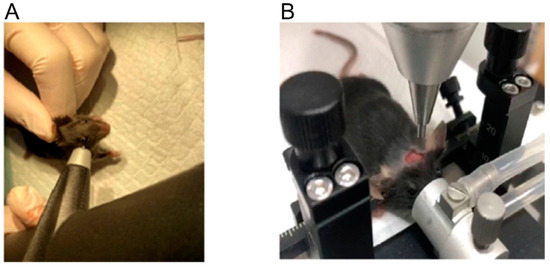 Before Impact-The composite neuroscore test (CN) was implemented to evaluate pretraumatic neurological function [16]. Mice underwent a battery of tests: right and left forelimb and hindlimb flexion and right and left lateral pulsion. For each task, animals were scored on a scale of 0–4, with 0 valued at severely impaired and 4 at no impairment. Mice were anesthetized with 3% isoflurane followed by maintenance of anesthesia with 2% isoflurane. The level of anesthesia was monitored until the animal reached the level of surgical anesthesia, characterized by showing loss of pedal withdrawal reflex. The mice were placed prone on the heating pad to keep the body temperature maintained at 37 ± 0.5 °C during the operation. A funnel-shaped nasal cone was used to keep the mice under anesthesia. The head top was shaved and a mid-line incision was made from bregma to lambda, to expose the surface of the skull. The Icare TONOLAB (Vantaa, Finland) was used to measure the intraocular pressure before impact (Figure 1A).