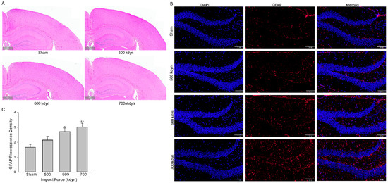 Histological analysis of the brain in the frontal cortex and hippocampus 2 h after mTBI with various impact forces. Sections were stained with hematoxylin and eosin (A) or GFAP (B). Scale bars indicate 500 μm in (A) and 100 μm in (B). (C) Summary data for (B). Data are presented as mean ± SEM. * p < 0.05, ** p < 0.01 compared to sham.