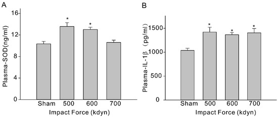 To evaluate systemic inflammation, we then analyzed 3 types of inflammatory cytokines, including IL-6, IL-10, and IL-1β, in the plasma of the sham and mTBI mice. At 2 h after injury, the level of IL-1β (pg/mL) in plasma increased significantly (Figure 3B, sham: 1037 ± 45 vs. 1421 ± 101 (500 kdyn), 1364 ± 47 (600 kdyn), 1405 ± 90 (700 kdyn)), while the level of IL-10 was not significantly changed, in all mTBI groups compared to the sham group, and this is consistent with the TBI data obtained in human subjects [17] and other reported rodent mTBI models [15,18]. Increased IL-6 level was another important biomarker in human mTBI [17], as well as in rodent mTBI models [15,18]. However, we failed to detect significant change in the plasma level of IL-6 in our mTBI mouse model, compared to the sham group. After TBI, assembly of oxidative stress-related molecules are produced in the brain and the innate antioxidants, such as SOD, are activated accordingly [19]. In this case, we measured the plasma SOD level using an ELISA kit, and it was showed in the results that the plasma SOD levels (ng/mL) of the mTBI mice were also elevated with the impact forces of 500 and 600 kdyn (Figure 3A, 13.6 ± 0.7, n = 5 and 13.0 ± 0.4, n = 5, respectively), compared to the sham group (10.34 ± 0.46). However, the SOD level was not significantly changed in the mTBI mouse with 700 kdyn impact force (10.61 ± 0.42).