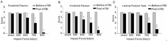 Effect of mTBI caused by gradient impact force on composite neuroscore behavioral, including forelimb flexion (A), hindlimb flexion (B) and lateral pulsion task (C), in C57/BL6 mice. Testing was completed within 2 h after TBIs. The dead mice scored zero. Data are mean ± SEM. * p < 0.05 compared to sham.