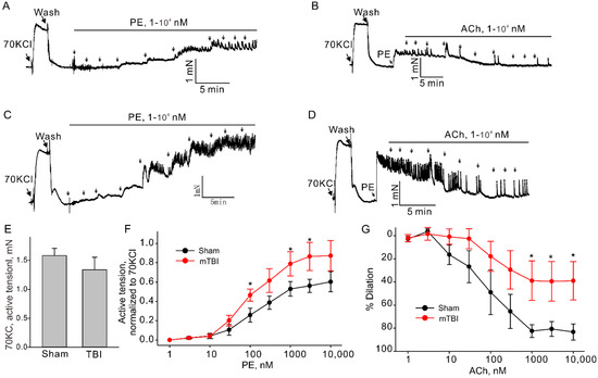Effect of mTBI on endothelial function in mouse aortic arches 2 h after mTBI. (A,C). The representative traces of active tension changes in sham and mTBI mice induced by phenylephrine (PE). (B,D). The representative traces of aortic dilation induced by acetylcholine (ACh) in sham and mTBI mice. (E). Statistical graphs comparing the active tensions-induced by 70 mM KCl. (F). Concentration-response relationships for PE-induced contractions in aortic arch rings from sham and mTBI mice. (G). Concentration-response relationships for Ach-induced dilation. Data are presented as mean ± SEM, * p < 0.05 compared to sham.