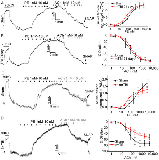 TBI effects predominantly the brain, but it is also known to cause impairments in other organs [20,21]. There is evidence suggesting that TBIs have significant effect on the systemic vasculature, including mesenteric and aortic vasculature [9,10]. Therefore, we further investigated the possible whether this mTBI causes endothelial dysfunction in the conduit systemic circulation-induced our mTBI modeling. Firstly, isometric tension recordings were performed on rings of aortic arch obtained from mice subjected to the mTBI with 600 kdyn impact force or sham surgical procedure after 2 h post-injury. As shown in Figure 5, mTBI showed no effect on the constructions induced by 70 KCl, while, it increased the amplitude of phenylephrine (PE)-induced contractions of the mTBI rings, compared to sham rings (10 μM PE induced active tension normalized to the peak amplitude of 70 mM KCl-stimulated contraction: 0.56 ± 0.1 versus 0.81 ± 0.2 for sham and mTBI, respectively, Figure 5), indicating that the mTBI aortas were more sensitive to phenylephrine. We then assessed endothelial function by examining the acetylcholine (ACh)-induced relaxation of aortic rings, which pre-contracted with phenylephrine. Compared to sham rings, the mTBI rings exhibited significantly reduced acetylcholine-induced dilations (10-μM ACh-induced dilations: 88.59 ± 13.2%, n = 5 versus 45.9 ± 18.9%, n = 6 for sham and TBI, respectively, Figure 5). We also investigated whether mTBI-induced changes in vascular reactivity and endothelial function would persist for a longer period, and no significant difference was detected between the TBI and sham groups 21-day post-injury (Figure 6A,B), which was consistent with the observations in previously reported mTBI mouse model [9].