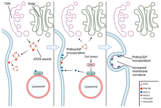 A model of formation of the omegasome. ATG9 vesicles carry PI4K IIIβ from the Golgi and trans-Golgi network to the omegasome formation site. PI4K IIIβ enriches the ER membrane in PtdIns(4)P, which binds ULK1/2 after its AMPK-mediated release from mTORC1 at the lysosomal surface. ULK1/2 subsequently recruits PIKC3C, which enriches the ER membrane in PtdIns(3)P, resulting in increased membrane curvature. As more PtdIns(3)P is incorporated, the highly curved membrane forms the omegasome, where the phagophore may be nucleated.