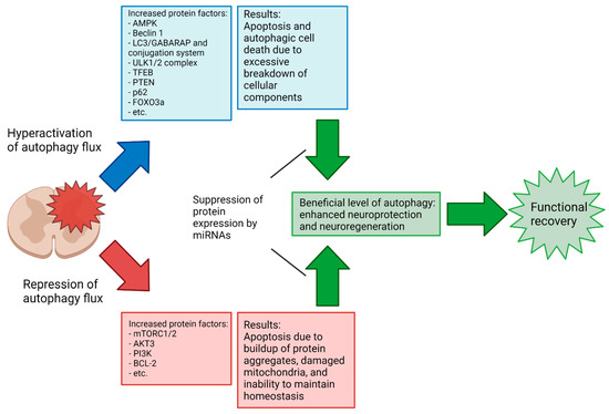 Potential role of miRNAs in promoting functional recovery in SCI. Autophagy may be hyperactivated or repressed to non-optimal levels at a given phase of the SCI secondary injury, leading to poorer recovery or even itself causing deleterious effects. An understanding of the effects that autophagy has on different SCI types and at different phases of secondary injury will be vital to developing effective therapies.