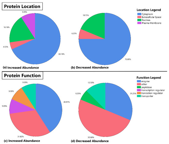 The changes in proteomic profiles differed based on annotated location and function of the protein. Approximately 65–75% of proteins that had either increased or decreased abundance were located within the cytoplasm, suggesting a relatively large effect of medication treatment on the regulation of these proteins. Twenty percent of proteins with either increased or decreased abundance were found in the nucleus, while approximately 5% of each group were found in the endoplasmic reticulum. Increased abundance had ~9% of proteins in the plasma membrane while no proteins were found in this location for decreased abundance.