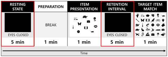 A schematic of the eyes-closed resting electroencephalography (EEG) and memory test protocol. The resting-state and retention interval (red squares) were used for analysis in the study.