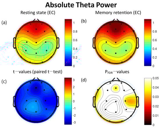 Topographies of absolute theta power during eyes-closed resting state and the retention interval of the visual working memory (VWM) task, t-map, and pFDR-map. (a) Absolute spectral power of theta band during the resting state (b) Absolute spectral power of theta band during the retention interval of VWM task (c) Topographical distribution of t-values (paired t-test) (d) Topographical distribution of the corresponding False Discovery Rate corrected p-values (paired t-test). EC: eyes closed, FDR: False Discovery Rate.