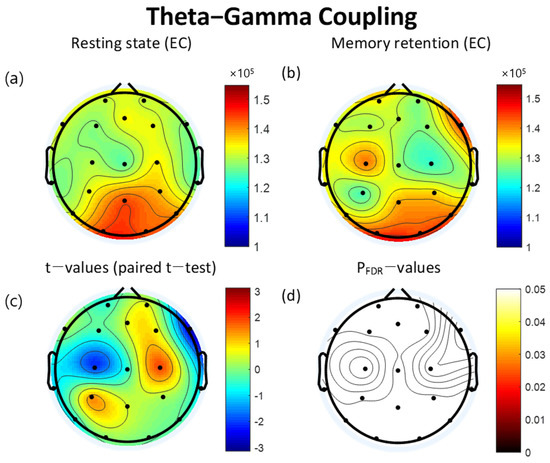 Topographies of theta-gamma coupling (TGC) during eyes-closed resting state and the retention interval of the visual working memory (VWM) task, t-map, and pFDR-map. The topographic maps represent the probability of paired t-test between resting state and VWM task. (a) Modulation index (MI) of TGC during the resting state. (b) MI of TGC during the retention interval of VWM task (c) Topographical distribution of t-values (paired t-test). (d) Topographical distribution of the corresponding False Discovery Rate corrected p-value (paired t-test). EC: eyes closed, FDR: False Discovery Rate.