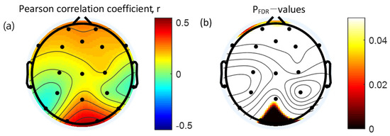 Topographical representation of the statistical results of the Pearson’s correlation analysis between the absolute gamma power and Wender Utah Rating Scale. (a) Pearson’s correlation coefficients. (b) Topographical distribution of the corresponding False Discovery Rate corrected p-value. FDR: False Discovery Rate.