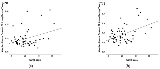 Pearson’s correlation coefficients were used to establish the correlation between the absolute gamma power and WURS. Absolute gamma during the retention interval period of the VWM task was significantly and positively correlated with the WURS in the occipital area (O1, r = 0.34, p = 0.010; O2, r = 0.46, p < 0.001). Results of the Pearson’s correlation analysis between the absolute gamma power during the VWM task and WURS scores are presented in Table 5. The topographical features of the correlation are presented in Figure 5.
