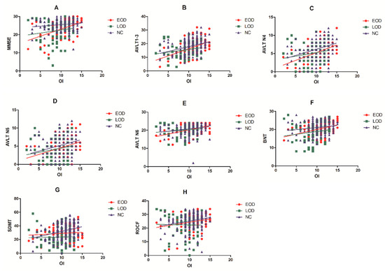 Correlation analyses between OI and cognitive function in EOD, LOD and NC groups.