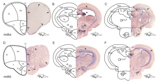 3.1. The Expression Patterns of mdka and mdkb Differ in the Telencephalon but Overlap in the Posterior Brain