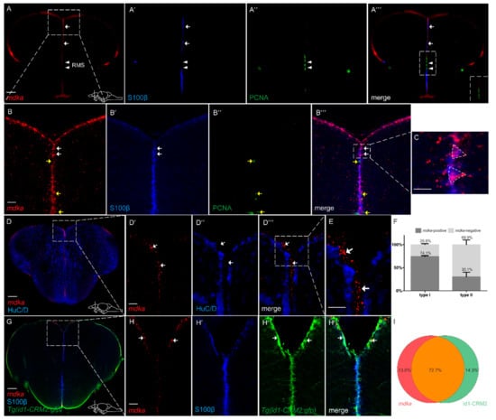 In order to gain a deeper understanding of the role mdka plays during regeneration, we next asked in which cell type mdka is expressed. To address this question, we combined fluorescent in situ hybridization (FISH) against mdka mRNA with Immunofluorescence (IF), using antibodies against S100β on cross-sections of the zebrafish telencephalon (Figure 2). Again, expression of mdka mRNA was detected along the ventricular zone of the telencephalon (Figure 2A–A‴,B–B‴) and mainly expressed in S100β + RGCs (white arrows, Figure 2A–A‴,B–B‴, quantification Figure 2F). However, we observed a lack of mdka expression between the ventral and dorsal nuclei of the ventral telencephalon (white arrowheads, Figure 2A–A‴). This region corresponds to the rostral migratory stream (RMS), which is an area with high proliferative potential, as it is occupied by committed progenitor cells called neuroblasts, and lacks RGCs []. To further confirm that mdka is not expressed in proliferating cells, we co-stained telencephalic cross-sections with the proliferation marker PCNA (Figure 2A,A″,A‴,B″–B‴). mdka expression was not detected in PCNA+ cells (yellow arrows Figure 2B,B″,B‴, quantification Figure 2F), demonstrating that mdka is a gene which is expressed in qRGCs. Additionally, we used an anti-HuC/D (Hu) antibody to label post-mitotic neurons and found no expression of mdka mRNA in the HuC/D+ neurons (arrows Figure 2D–D‴,E). When evaluating single-cell data from Lange et al. (2020), we detected a high correlation between mdka and the gene id1, which we previously identified as being exclusively expressed in qRGCs [,]. In order to confirm the co-localization between id1 and the earlier observation that mdka expression is mainly located to qRGCs, we used the transgenic zebrafish line Tg(id1-CRM2:gfp), which recapitulates the expression of the endogenous id1 gene and marks qRGCs []. Indeed, co-expression of mdka mRNA with the signal for GFP was noted in 72.7% of cells (Figure 2G and white arrows Figure 2H–H‴, quantification Figure 2I), locating mdka expression to qRGCs. Taken together, the observed—and, by single-cell sequencing data, confirmed—co-localization with id1 verifies that mdka is expressed in qRGCs.