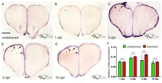 In order to model brain injury and trigger regeneration, we utilized a stab-wound assay during which we inserted a syringe needle through the skull into one hemisphere of the telencephalon, leaving the other hemisphere as uninjured control [,]. In an RNA sequencing experiment that was previously carried out in our lab, comparing expression levels of different genes between injured and uninjured telencephalic hemispheres at 5 days after the injury, mdka was found to show a 1.37-fold expression increase after injury (p-value = 2.68−9) []. In an effort to confirm these results, we carried out a chromogenic ISH for mdka mRNA on telencephalic cross-sections of adult brains at 5 dpl (Figure 3D). We found that indeed a higher expression of mdka mRNA could be observed in the injured left hemisphere (black arrows, Figure 3D), confirming the RNA sequencing results. To evaluate possible expression changes over time as a response to injury, as well as identifying a possible peak of mdka expression, we additionally conducted ISH experiments at different time points after the injury. Immediately after the injury, at 1 dpl, we could observe no difference in the expression of mdka between the injured and uninjured hemispheres (Figure 3B). In comparison to an uninjured telencephalon, the expression does not change (compare Figure 3A with Figure 3B). After 5 dpl the expression in the injured hemisphere decreases until it reaches baseline levels at 10 dpl (arrows Figure 3D,E). We also performed a quantitative reverse transcription PCR (RT-qPCR) experiment comparing the level of mdka expression in injured and uninjured hemispheres at the different time points, confirming the expression time course and determining a peak of expression between 3 dpl and 5 dpl (Figure 3F).