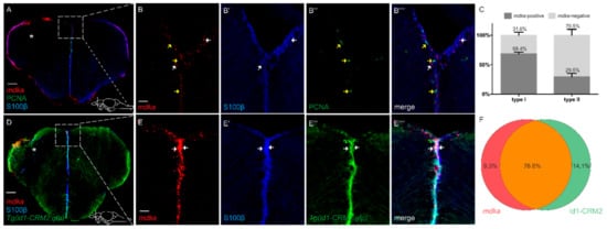 In this work, we also observed that the expression of mdka is not detectable in mature neurons but co-localizes with S100β, a marker for RGCs, the NSCs of the telencephalon, which is in accordance with recently published single-cell data []. This result is also in line with previously reported data in other tissues where mdka expression is also located in the tissue-specific stem cells, such as the Müller glia of the adult zebrafish retina [,]. Additionally, in this study we observed that mdka expression is mainly restricted to cells which are negative for the proliferation marker PCNA under constitutive and regenerative conditions, leading to the conclusion that the gene is expressed by cells which are non-proliferating RGCs and therefore quiescent type I stem cells. This is also confirmed by co-staining with the transgenic line for id1 which marks qRGCs []. In sharp contrast to that, several reports show that mdka is expressed in activated stem cells in different tissues, including the zebrafish retina, where mdka is expressed in proliferating Müller glia during regeneration []. Additionally, loss of mdka is associated with decreased proliferation after injury of the fin or after photoreceptor ablation in the retina [,]. This obvious contradiction is possibly due to the fact that, in the brain, the source of stem cells greatly differs from other tissues. In the zebrafish retina, for example, regeneration is dependent on Müller glia which first need to de-differentiate in order to re-enter the cell-cycle and generate multipotent progenitors []. Furthermore, in the zebrafish fin, de-differentiated osteoblasts provide progenitor cells to repair the fin rays after injury []. In contrast, in the telencephalon, there is a constitutive pool of quiescent neural stem cells which can be recruited upon injury []. mdka does not necessarily have to play the same role in the regenerative processes of these different tissues. An in-depth analysis of the regulation and function of mdka is needed to elaborate further on the specific role of mdka during brain regeneration in the adult zebrafish.