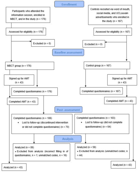 A total of n = 148 (n = 59 in the control group; n = 89 in the MBCT group) participants were included in the analyses. A sub-sample of participants n = 86 (n = 43 in the control group; n = 43 in the MBCT group) also completed the mAMT. This sub-sample was a convenience sample of participants who were willing and able to complete the task within the specific time frame following recruitment. For details on the flow of participants throughout the study, please see Figure 1. For more details on how the data was pre-processed, please see the pre-registration section: “Prior work based on this dataset” [60].