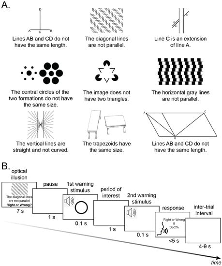 (A) Examples of the experimental stimuli composed by Papageorgiou and colleagues (2020) [6]. The illusions depicted are the following: vertical-horizontal, Zöllner, Poggendorff, Ebbinghaus, Kanizsa’s triangle, café wall, Hering, Shepard tables, and Sander. The images have been obtained by the authors from Wikipedia website where they were made available under a CC BY-SA 3.0 license; (B) Illustration of the trial structure. First, an optical illusion is presented on screen for 7 s, together with a statement and the question Right or Wrong? below the stimulus. A blank screen is then presented for 1 s, followed by a 0.1 s warning stimulus tone. Participants are given 1 s to think of their response. A second warning stimulus tone is then presented for 0.1 s. Afterwards, participants verbalize two responses: 1. Whether the statement is right or wrong, and 2. What is their degree of confidence (DoC) for their answer. There is an inter-trial interval jittered from 4 to 9 s.