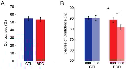 Degree of Confidence (DoC): A 2 (correctness: correct vs. incorrect) × 2 (group: CTL vs. BDD) mixed ANOVA revealed that participants were more confident of their answers when they responded correctly () compared to when they responded incorrectly () (main effect of correctness (). Results also showed a significant correctness × group interaction (). To investigate the interaction further, planned contrasts were conducted. Interestingly, the BDD group exhibited significantly lower DoC when responding incorrectly compared to when responding correctly (), whereas the CTL group showed no significant difference in DoC between conditions (). Finally, the BDD group showed significantly lower DoC than the CTL group for incorrect answers (); however, that was not the case for correct answers () (Figure 2B).