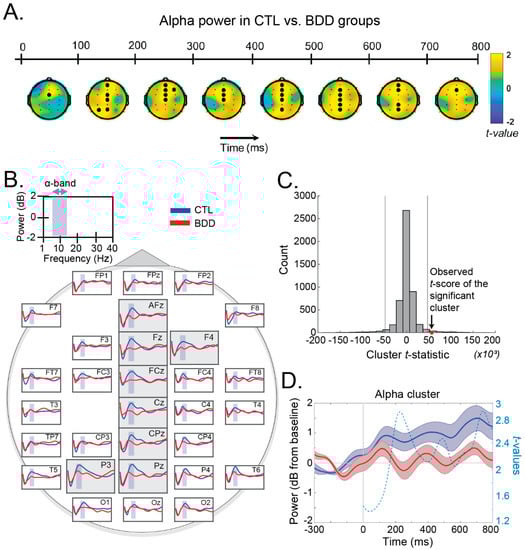 Subsequently, empirical distribution curves of the group differences were estimated using 5000 random permutations by shuffling the subject labels (CTL vs. BDD). In each randomly permuted instance, we calculated the sum of t values within each cluster. Then, the maximum (absolute value) cluster score was considered as the cluster t-statistic. All randomizations were conducted for a rejection of the null hypothesis and a control of false alarm rate at (two-tailed). Clusters formed by the actual labels with a t value exceeding the t critical values acquired from the permutation analysis were finally identified. As a control analysis, the same statistical procedure was conducted also for the other bands (delta, theta, beta, and gamma).