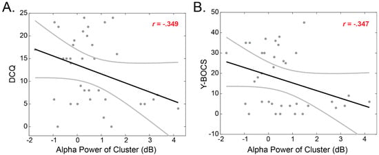 Relationship (Pearson’s coefficients) between the alpha power of the fronto-central/parietal cluster of electrodes and BDD questionnaires. (A) Correlation between alpha power and the DCQ questionnaire; (B) Correlation between alpha power and the Y-BOCS questionnaire. Gray lines illustrate 95% confidence interval.