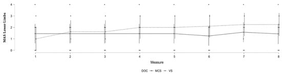 A significant difference was observed in the evolution of spasticity in patients based on their level of consciousness for the lower limbs (F (7, 107.07) = 3.196; p = 0.004). A significant interaction was found between DOCs and the repeated MAS measurements of the lower limb where VS patients developed more spasticity in the second year of observation. No other significant results were found for lower limb spasticity (see Table 3 and Figure 2).