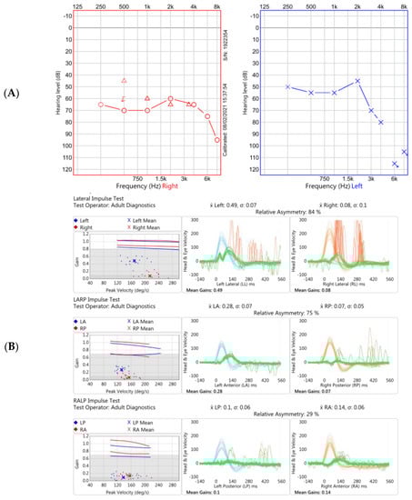 Two of the audiovestibular investigations performed at our Centre 18 months after original onset of symptoms. (A). Pure tone audiogram demonstrating moderate-to-severe hearing loss on the right (red trace) and moderate-to-profound loss on the left (blue trace). (B). Video head impulse test (vHIT) in Case 1 showing reduced gain (eye velocity: head velocity) of the vestibular ocular reflex across horizontal (top panel), and vertical (RALP plane, middle panel; LARP, bottom panel) planes. Note normal vestibulo-ocular reflex (VOR) gains using this vHIT device (GN Otometrics, Taastrup, Denmark); ≥0.8 for horizontal planes and ≥0.7 for vertical planes [20]. The traces show emergence of covert saccades occurring during the head movements, particularly on the right, reflective of dynamic vestibular compensation. Data not shown from impulsive rotational testing and oculomotor examination via videonystagmography.