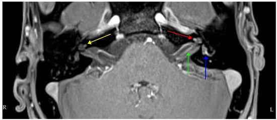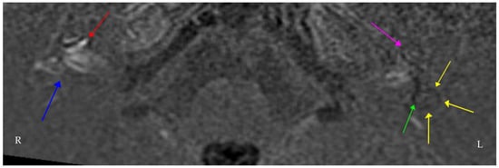 Axial T1 volumetric interpolated brain examination (VIBE) fat-suppressed (FS) MRI post-intravenous gadolinium showing bilateral cochlear enhancement (yellow right, red left), more on the left than the right and left-sided vestibular and lateral semicircular canal enhancement (blue). The left intracanalicular cochlear nerve shows increased contrast enhancement (green).