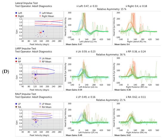 - McGarvie, L.A.; MacDougall, H.G.; Halmagyi, G.M.; Burgess, A.M.; Weber, K.P.; Curthoys, I.S. The Video Head Impulse Test (vHIT) of Semicircular Canal Function—Age-Dependent Normative Values of VOR Gain in Healthy Subjects. Front. Neurol. 2015, 6, 154. [Google Scholar] [CrossRef] [Green Version]