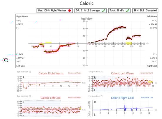 Vestibular investigations undertaken five months following Pfizer-BioNTech SARS-CoV2 vaccination after the onset of imbalance and ataxia in Case 3. (A). vHIT showed reduced gain (0.38) with refixation saccades in the right lateral plane. (B). Cervical Vestibular Evoked Myogenic Potential (cVEMP) response was absent on the right (red traces, left panel). (C). Monothermic caloric testing demonstrated 100% right-side canal paresis (note almost absent nystagmus on right warm and right cool traces).