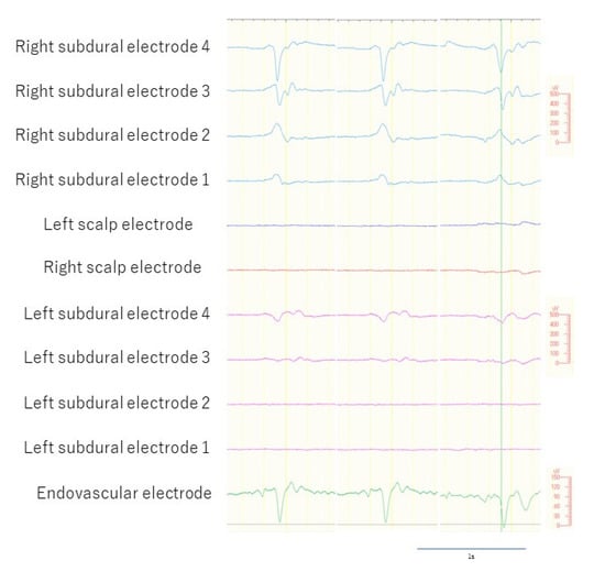 We included epileptiform discharges that were: (1) spikes and sharp activities with or without following slow activities; (2) detected by the right SDE only. We excluded epileptiform discharges that were: (1) slow waves or sharply contoured discharges; (2) detected by bilateral SDEs; (3) detected by scalp EEG. Since the eEEG electrode was placed in the superior sagittal sinus, we regarded measurement of epileptiform discharges that were detectable by the left SDE as potentially inappropriate because these discharges could have been secondary synchronized activities through commissural fibers such as the corpus callosum, and we could have, thus, been measuring corpus callosum activities or quasi-generalized activities, rather than the localized epileptogenicity [25]. We recorded scalp, SDE, and eEEG measurements simultaneously for 60 min (Figure 4).