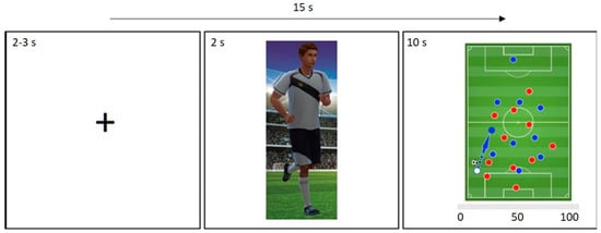 Illustration of an experimental trial. At the start of each trial, a fixation cross was presented for a duration of 2 to 3 s (variation due to jittering). Next, a player representing the self, rival, in-group, or out-group was displayed for 2 s. Subsequently, a soccer game scenario was presented for 10 s; in this latter phase, our participants estimated the likelihood for a successful pass (rating range 0–100%).