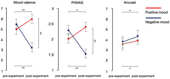 Mood ratings for the mood valence scale (left), the PANAS (middle), and the arousal scale (right) with CI of 95% (** p < 0.001, * p < 0.01).