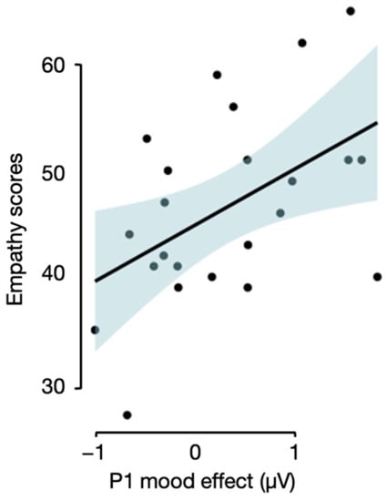Moreover, a correlational analysis indicated that the P1 mood effect (i.e., the difference in P1 amplitudes between a positive and negative mood) correlated positively with the Empathy Quotient scores [], r = 0.49, 95% CI (0.10, 0.75), t(21) = 2.56, p = 0.018 (see Figure 3).