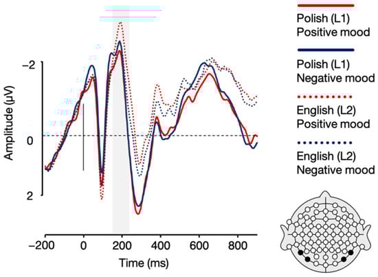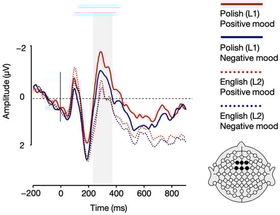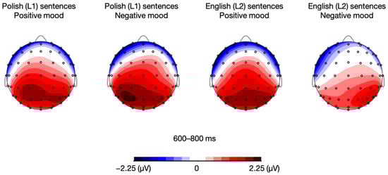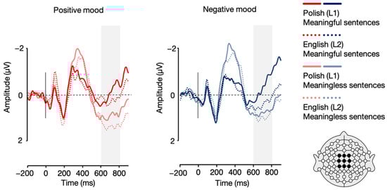 Similarly, Kissler and Bromberek-Dyzman [] asked unbalanced German–English bilinguals to watch mood-inducing film clips and categorise decontextualised words as positive, negative, or neutral in an ERP study. They observed an attenuated left-lateralised N1 response to L1 words in the positive compared to the negative mood condition but no between-mood difference for L2 words, suggesting that the effects of mood on the early stage of word processing might be limited to L1. However, they found no mood–language interaction in either the N400 or the LCP time windows, which points to a possibly short-lived effect of mood induction in L1 and L2, at least in the case of single word processing. Altogether, bilingual research has shown that emotional word processing can be differently modulated by positive and negative moods, at least at the initial stages of individual word processing. To our knowledge, there is no tangible evidence to date regarding the effect of positive and negative moods on L1 and L2 semantic processing in a sentential context.
