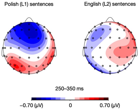 Topographic distribution of the ERP amplitude difference between positive and negative mood conditions for Polish (L1) and English (L2) sentences in the 250–350 ms time window.