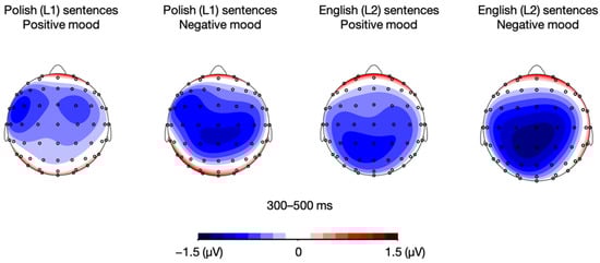 Topographic distribution of the difference between ERP amplitudes in the meaningful and meaningless conditions for Polish (L1) and English (L2) sentences in the positive and negative mood conditions in the 300–500 ms time window.