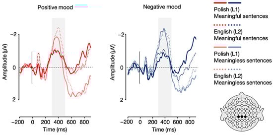 Building upon previous research, we expected to observe a classic N400 modulation by sentence meaningfulness, with more pronounced N400 amplitudes for meaningless than meaningful sentences (e.g., “These houses were transformed into country lobsters/mansions permanently.”) in both L1 and L2 []. We also hypothesised that while N400 amplitude would be differently modulated by positive and negative moods in L1 (i.e., N400 amplitudes elicited by meaningful sentences would be reduced in a negative relative to positive mood) [,], L2 processing would be less sensitive to mood manipulation.