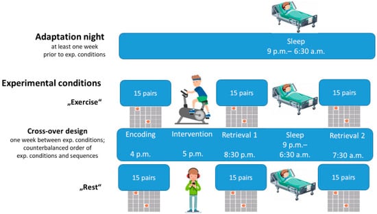 Overall design—timeline of encoding, intervention (exercise and rest), Retrieval 1, sleep, and Retrieval 2 (adopted from []).