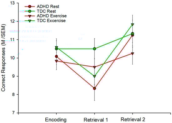 Attention deficit hyperactivity disorder (ADHD) is characterized by developmentally inappropriate levels of inattention, hyperactivity, and impulsivity []. Among other neurocognitive impairments, such as working memory deficits or impaired executive functions in general [,], deficits in declarative memory consolidation have also been found in ADHD, both in adults [,] and in children [,]. Declarative memory skills are important for scholastic development and for social interaction []. With a prevalence of ADHD of 5–7% [], these learning deficits are of relevance for one or two or even more children in almost every school class. Declarative memory deficits in ADHD have been hypothesized to be an epiphenomenon of defective prefrontal functioning during (slow wave) sleep [,], and we demonstrated previously that this deficit could be compensated for by direct-current stimulation over prefrontal areas []. Probably more suitable or usable on a larger scale in terms of treatment, closed-loop acoustic stimulation during SWS enhanced (rewarded) declarative memories in typically developing children (TDC) but not in children with ADHD []. Given its positive effect on memory, physical exercise might be a straightforward and inexpensive approach to alleviate memory deficits in persons with ADHD.
